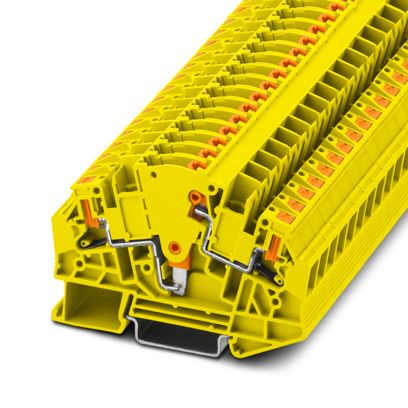 Din Rail Terminal Blocks 1350425 PTVME 6/S YE Series provides an advanced and efficient 2-level termination solution for 6mm² conductors. Featuring a user-friendly push-in connection system, this yellow terminal block allows for rapid, tool-free wiring, significantly reducing installation time and effort. Its design is optimized for easy mounting on standard DIN rails, making it a versatile component for various electrical installations and control cabinets.