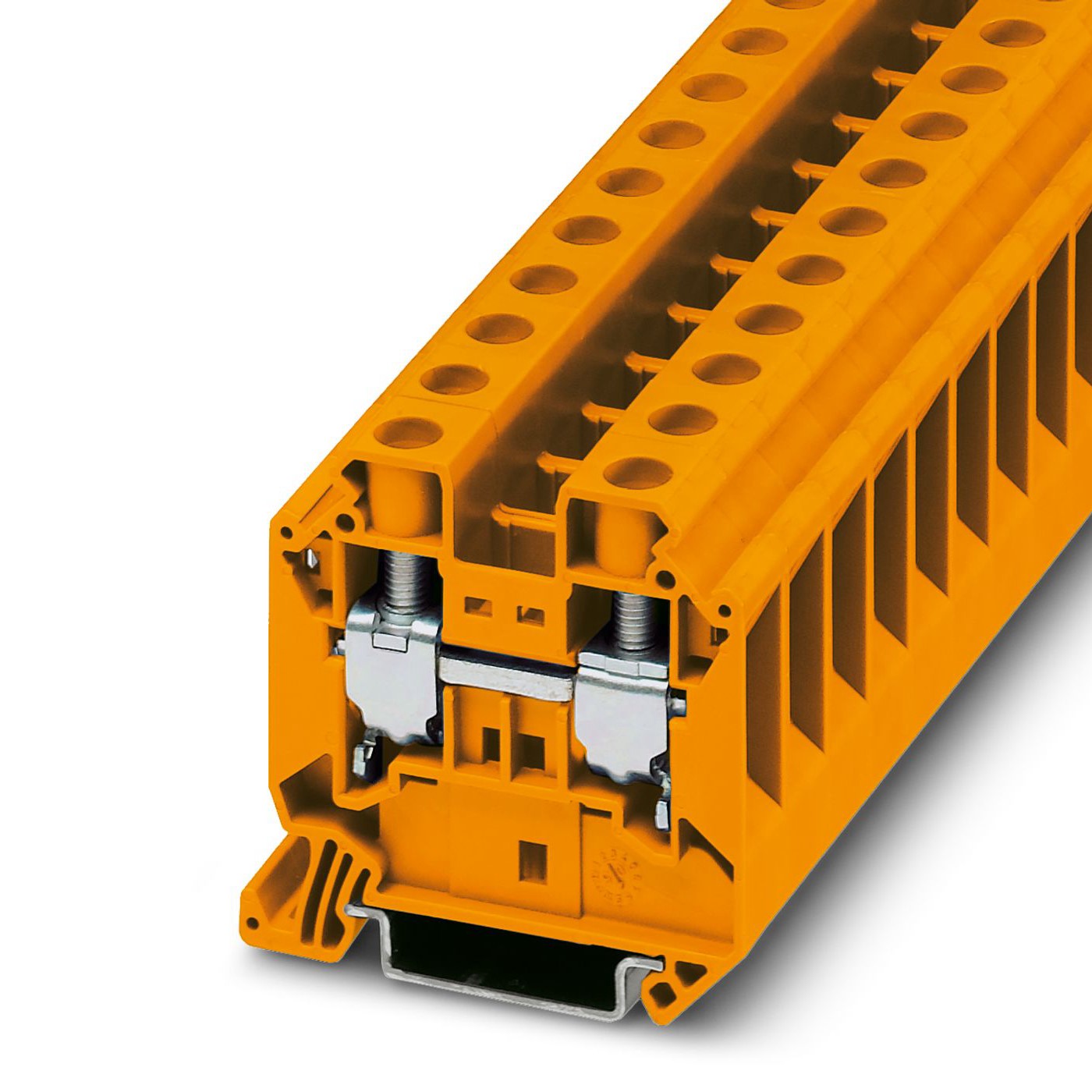 The Din Rail Terminal Blocks 3047468 is ideal for applications in industrial automation, power distribution, and control systems where reliable and organized wiring is paramount. Its robust construction and high-quality materials ensure longevity and consistent performance even under demanding operational conditions. The bright orange color aids in quick identification and safety protocols.