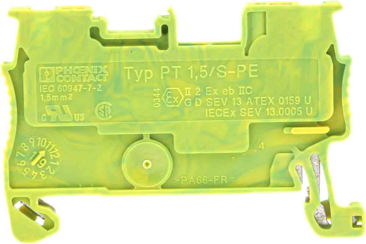 Din Rail Terminal Blocks 3208139 is an advanced, green/yellow, single-level terminal block from the PT 1.5/S-PE series, designed for conductors ranging from 0.14mm² to 1.5mm². It features a user-friendly push-in termination system and carries ATEX certification for safe use in hazardous environments.