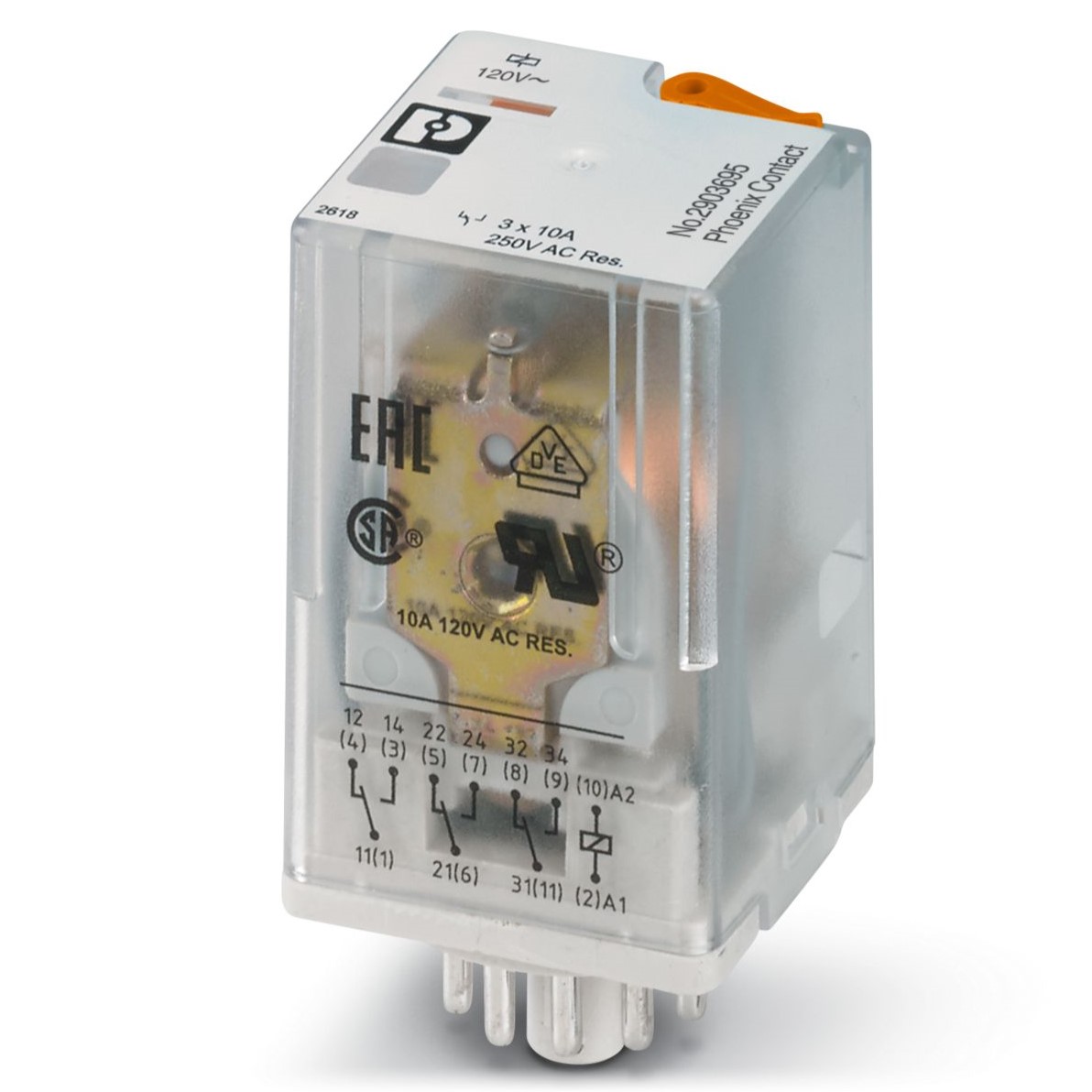 The Power Relays 2903695 is a high-performance plug-in power relay, engineered for reliable switching in demanding applications. This relay features a standard 120V AC coil and is capable of handling a 10A switching current across its 3PDT (3-Pole Double Throw) configuration, providing versatile control capabilities.