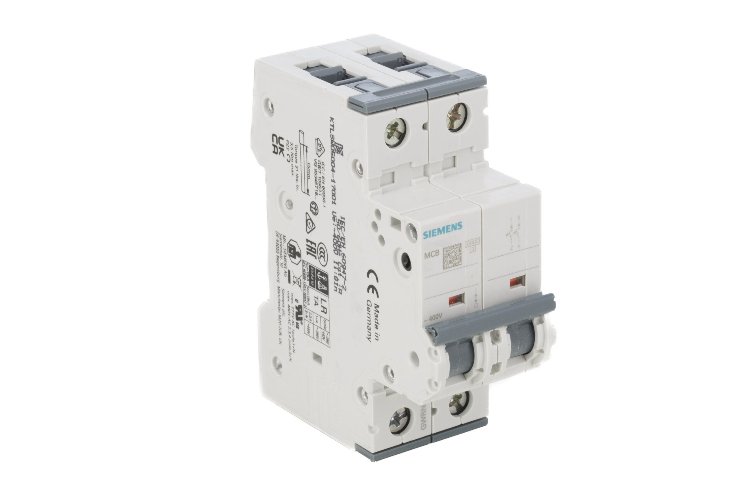 The Siemens 5SY4210-7 Sentron MCB is a high-performance miniature circuit breaker designed for superior electrical circuit protection. This 2-pole device features a 10A rating and a Curve C tripping characteristic, making it ideal for protecting circuits with moderate inductive loads. It operates reliably at 400V AC and offers a significant breaking capacity of 10kA, effectively safeguarding against damaging overcurrents and short circuits. The Siemens 5SY4210-7 ensures safety and operational continuity.